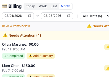 Process payments through Stripe, track unbilled sessions, and send invoices individually or in batch.